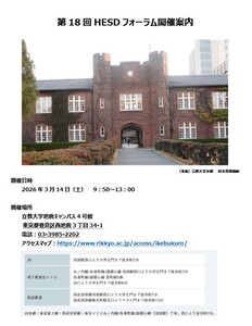 2006 年度から文部科学省が現代GPに環境教育を含めたことに伴い、現代GPでESDに取り組む大学が増えました。HESDフォーラムは、それらのESD推進大学が集まって、緩やかな情報交換のサロン的なネットワークを目指して設立され、2007 年に第 1 回フォーラムが岩手大学で開催されて以来、これまでに17回開催され、高等教育におけるESDの在り方や実践事例について議論してきました。今年度は、2026年3月14日(土)に立教大学池袋キャンパスで開催されます。大学等高等教育機関の皆様のみならず、高等教育におけるESDに関心のある方々の参加をお待ちしますので、ご参加につき、奮ってご検討いただくようお願いいたします。