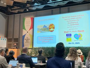 31カ国から147名の参加者が現地で、119名がオンラインで参加し、総計266名が参加しました。初日には、RCEの設立初期から関わっていた、RCEペナンの創設者であり、ウブントゥ委員会のメンバーでもあったDzulkifli Abdul Razak氏の基調講演があり、続いてUNU-IASによる出版物”Learning, Collaborating and Transforming – The 20-Year Journey of the Global RCE Network”の紹介が、続く全体会では、アフリカ、南北アメリカ大陸、アジア太平洋およびヨーロッパのRCEの地域アドバイザーや代表者による事例紹介とパネルディスカッションが行われました。午後には、ESD岡山アワードの表彰式が行われ、地域からESDを推進する優れた取組が表彰されました。