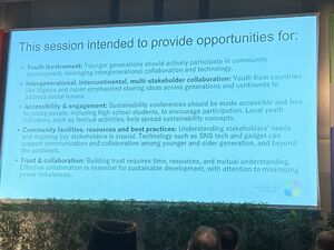 次に各地域のRCEユースコーディネーターによる事例紹介、パネルディスカッションが行われました。日本、韓国、インドネシア、ケニア、アメリカの若者から発表からは、活動への熱意を強く感じました。どうしたら世代を超えたコラボレーションができるかについては、お互いの考えを尊重すること、理解しようとすること、信頼がキーワードであると感じました。信頼関係を構築するには、互いに真摯に耳を傾けること、世代を超えた広範なコラボレーションには革新的な考え方が大切なこと、情熱をもって好奇心に従って大胆に行動することも強調されました。若者は経験不足であるために間違うこと、失敗することもありますが、それを温かく見守ることが大切であると思いました。